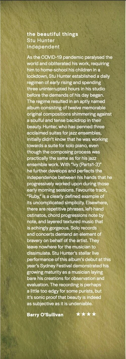 Multi award winning Australian composer and pianist Stu Hunter presents his new suite for solo piano - the beautiful things